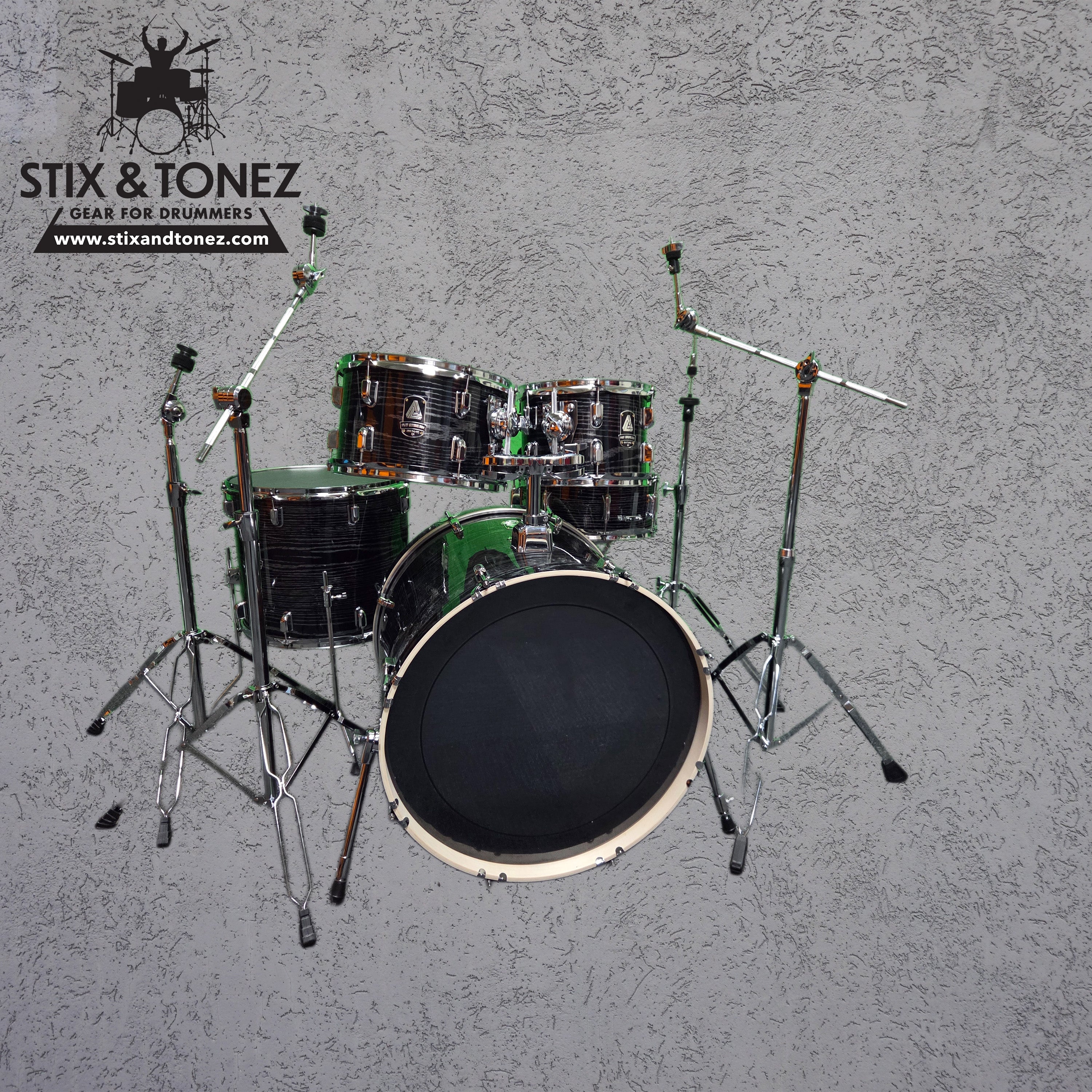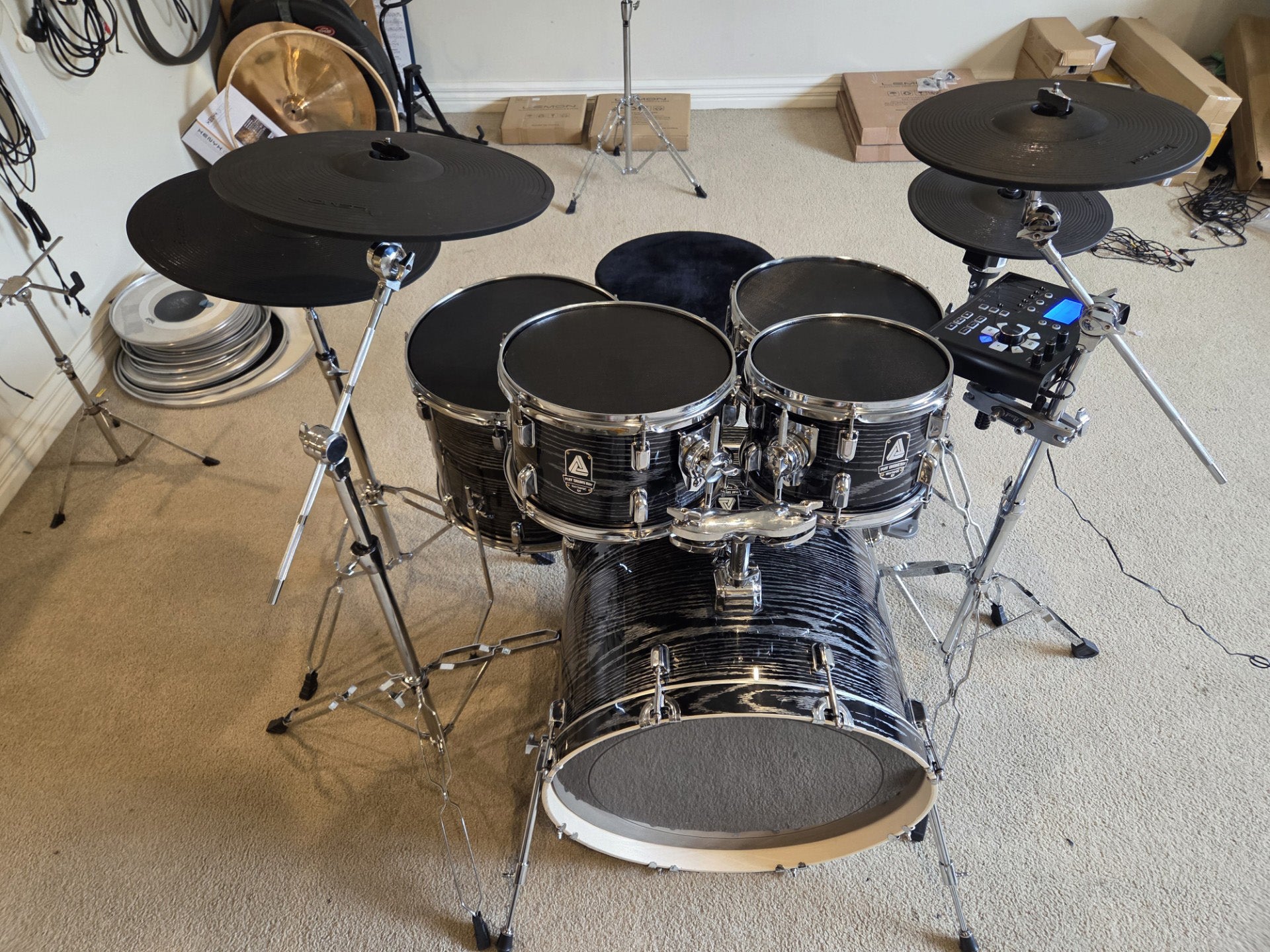 Brand New Black and Silver Woodgrain Converted Electronic Drum Kit SHELL PACK / STANDS / CYMBALS / MODULE